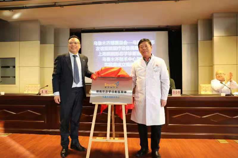 长三角协调会智慧医疗发展联盟理事长、科宝智慧医疗科技上(上海)有限公司董事长朱仁明与市友谊医院党委副书记、院长王刚共同为上海张江细胞形态学诊断医联体乌鲁木齐技术中心(智慧实验室)成立揭牌